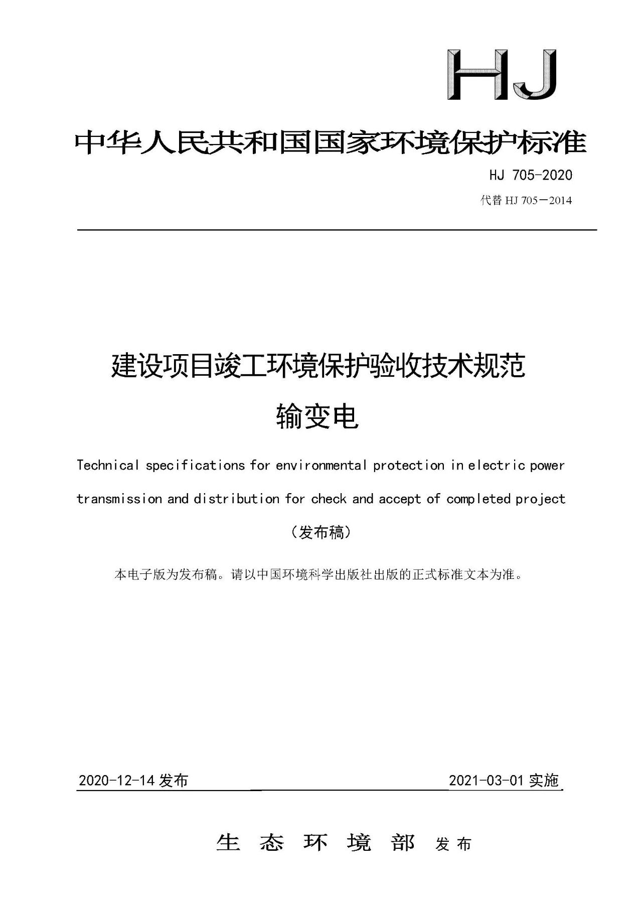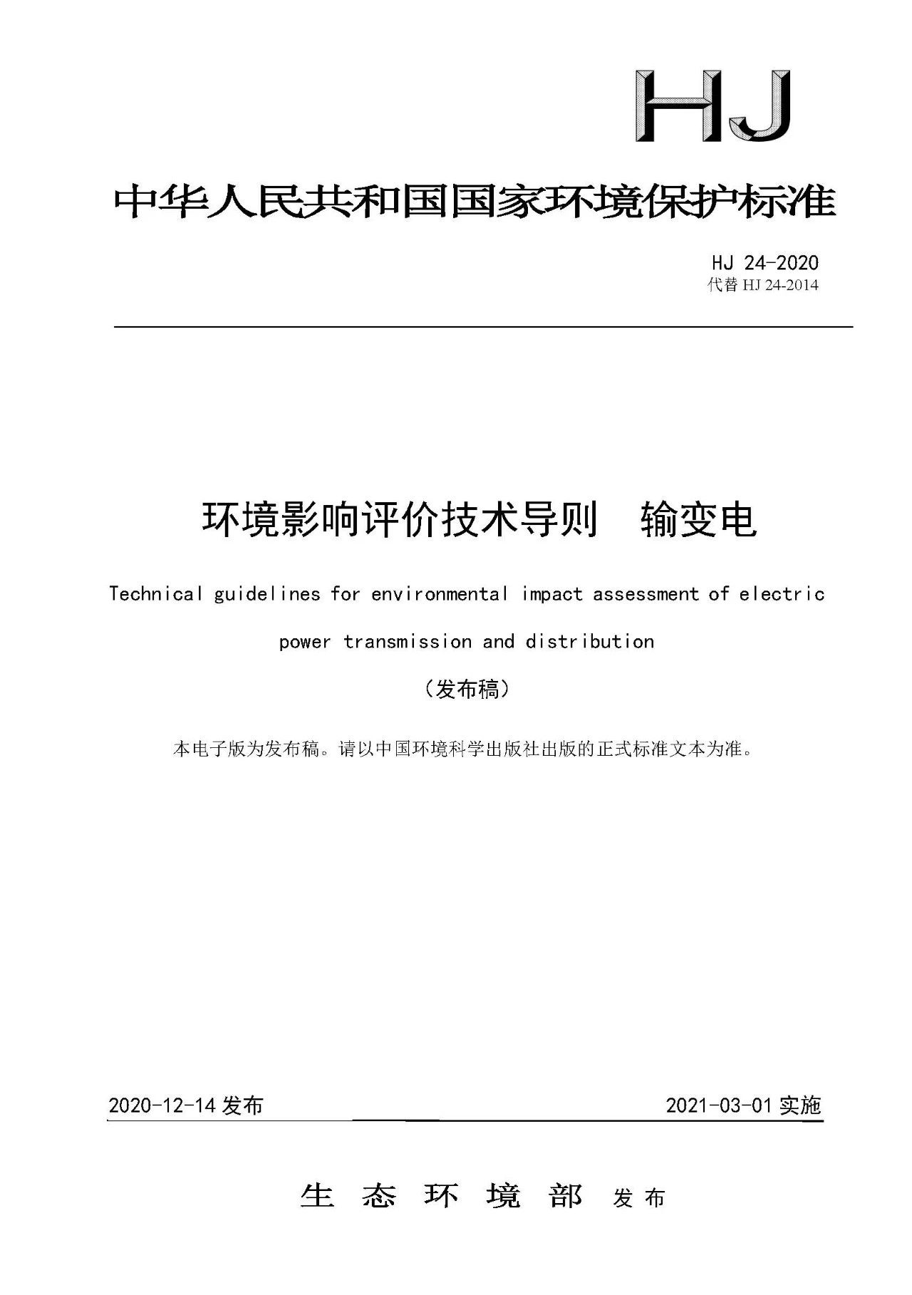 自上述標準實施之日起,《環(huán)境影響評價技術(shù)導則 輸變電工程》(HJ 24-2014)、《建設(shè)項目竣工環(huán)境保護驗收技術(shù)規(guī)范 輸變電工程》(HJ 705-2014)廢止。