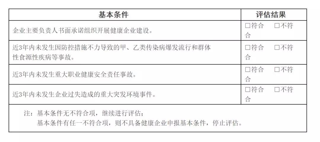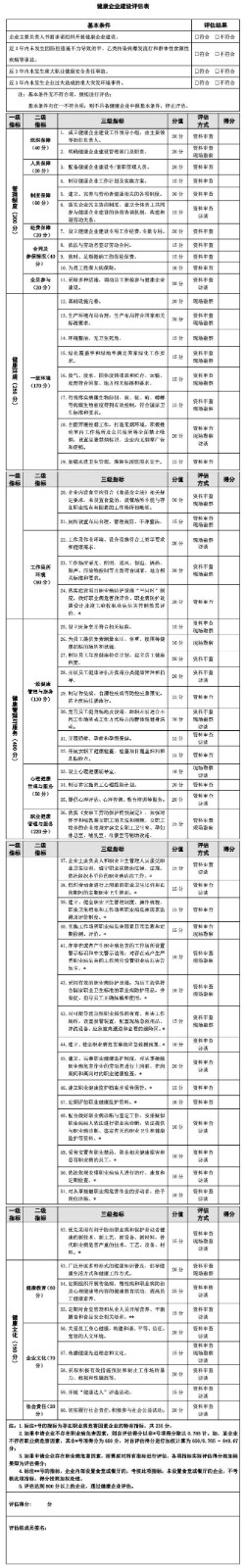 為科學、有序推進健康企業(yè)建設工作,指導各地、各企業(yè)開展健康企業(yè)建設與評估,全國健康企業(yè)建設技術指導單位(中國疾病預防控制中心職業(yè)衛(wèi)生與中毒控制所)組織本領域專家,按照《關于開展健康企業(yè)建設的通知》(全愛衛(wèi)辦發(fā)〔2019〕3號)和《健康企業(yè)建設規(guī)范(試行)》的內容與要求編寫了本指南。 各地可結合本地區(qū)經濟社會發(fā)展水平、行業(yè)分布特點、健康城市建設總體部署和企業(yè)員工實際需求等因素,參照本指南制定符合本地區(qū)健康企業(yè)建設需求的技術評估指標體系和指標評估細則,定期對健康企業(yè)建設效果進行評估,不斷完善健康企業(yè)建設。 一、 編制依據(jù) 按照《中華人民共和國職業(yè)病防治法》《“健康中國2030”規(guī)劃綱要》《健康中國行動(2019-2030年)》《國務院關于進一步加強新時期愛國衛(wèi)生工作的意見》《全國愛衛(wèi)會關于開展健康城市健康村鎮(zhèn)建設的指導意見》《關于推進健康企業(yè)建設的通知》《健康企業(yè)建設規(guī)范(試行)》等文件要求,依據(jù)我國現(xiàn)行有效的有關法律法規(guī)、規(guī)范性文件、標準和已經批準的相關國際公約而編制。有關法律法規(guī)、規(guī)范性文件、標準今后若有更新,以最新版本為準。 二、 主要內容 01 健康企業(yè)建設評估表 根據(jù)《健康企業(yè)建設規(guī)范(試行)》內容,構建具體的健康企業(yè)建設評估指標體系,包括基本條件和具體指標兩部分。基本條件為一票否決項,具體指標包括企業(yè)通用指標43項(標注“**”號的指標1項,企業(yè)內部設置食堂或餐廳的考核適用此項指標)和存在業(yè)病危害因素企業(yè)特有指標17項(標注為“*”號項),評分采用千分制。 具體評估指標包括一級、二級和三級指標,第三級指標有相應的具體分值及評估方式。一級指標對應“管理制度”、“健康環(huán)境”、“健康管理與服務”、“健康文化”4個建設領域;二級和三級指標著眼于我國職業(yè)人群的主要健康問題及其影響因素。指標體系構建強調健康企業(yè)建設秉持“大衛(wèi)生、大健康”理念,實施“把健康融入所有政策”策略,堅持“共建共享”,同時強調預防為主,全方位全周期保障職業(yè)人群健康。