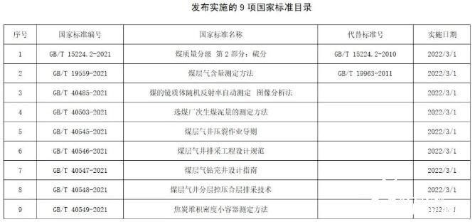 此次發(fā)布實施的煤炭領域國家標準中,《煤層氣含量測定方法》《煤層氣井壓裂作業(yè)導則》《煤層氣井排采工程設計規(guī)范》《煤層氣鉆完井設計指南》《煤層氣井分層控壓合層排采技術規(guī)范》等5項標準,將為我國低階煤煤層氣地質勘探與資源潛力評價和開發(fā)提供指導,優(yōu)化我國復雜地質條件地區(qū)煤層氣開發(fā)技術方案,推動煤層氣資源開采利用的最大化?!睹旱溺R質體隨機反射率自動測定 圖像分析法》《選煤廠次生煤泥量的測定方法》《焦炭堆積密度小容器測定方法》等3項方法標準,為煤炭資源評價、商品煤質量監(jiān)管等方面提供有力支撐?!睹禾抠|量分級 第2部分:硫分》對于科學評價煤炭資源中的硫分、指導煤炭生產(chǎn)和加工利用有著重要意義。