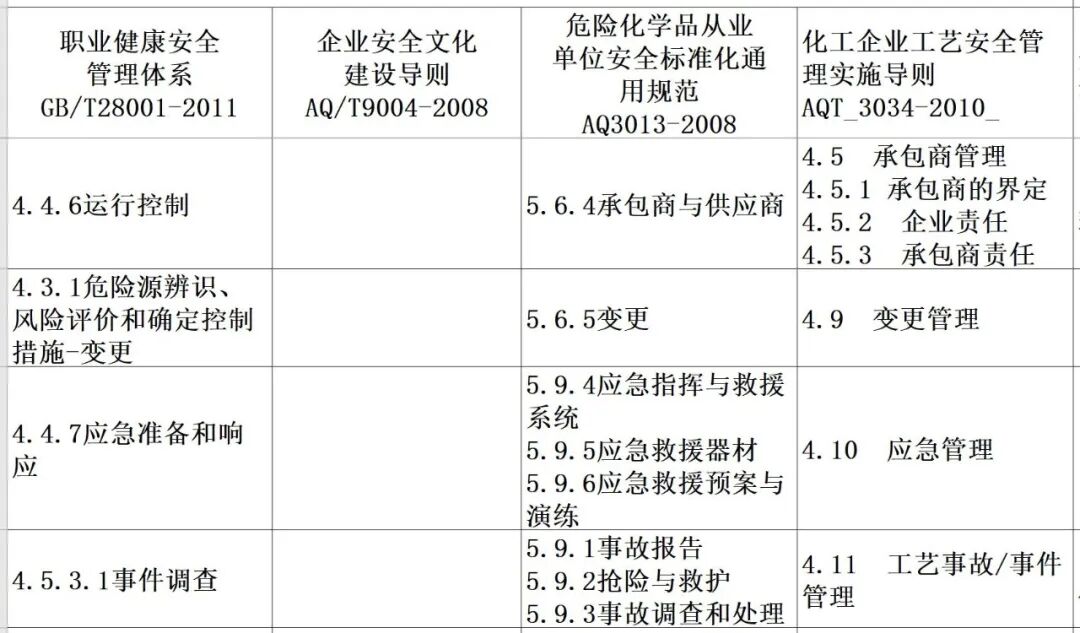厘清各體系的要素分布情況 有的企業(yè)很容易誤解,認(rèn)為國(guó)家推行的安全管理方法總是變來(lái)變?nèi)ァF鋵?shí),近年來(lái)強(qiáng)調(diào)過(guò)程安全管理,并不是否定其他管理手段。 通過(guò)對(duì)《職業(yè)健康安全管理體系》(GB/T28001-2011)、《企業(yè)安全文化建設(shè)導(dǎo)則》(AQ/T9004-2008)、《危險(xiǎn)化學(xué)品從業(yè)單位安全標(biāo)準(zhǔn)化通用規(guī)范》(AQ3013-2008)、《化工企業(yè)工藝安全管理實(shí)施導(dǎo)則》(AQT_3034-2010)等標(biāo)準(zhǔn)的要素進(jìn)行對(duì)比,可以得出結(jié)論:各標(biāo)準(zhǔn)要求差不多,只是側(cè)重點(diǎn)不一樣。 如上圖的風(fēng)險(xiǎn)辨識(shí)要素。GB/T28001里是4.3.1危險(xiǎn)源辨識(shí)、風(fēng)險(xiǎn)評(píng)價(jià)和確定控制措施;AQ3013里是5.2風(fēng)險(xiǎn)管理;AQT3034里是4.1工藝安全信息和4.2工藝危害分析;AQ/T9004是安全文化建設(shè),對(duì)風(fēng)險(xiǎn)辨識(shí)沒(méi)有太多關(guān)注,就沒(méi)有控制。 又如上圖的培訓(xùn)要素。GB/T28001里是4.4.2能力、培訓(xùn)和意識(shí);AQ/T9004里是5.5自主學(xué)習(xí)與改進(jìn);AQ3013里是5.4培訓(xùn)教育;AQT3034里是4.4培訓(xùn)。這也說(shuō)明所有的安全管理手段中,對(duì)培訓(xùn)都很重視。 再如上圖的承包商要素。GB/T28001放在了4.4.6運(yùn)行控制里面,屬于三級(jí)要素;AQ/T9004沒(méi)有將承包商要素納入;AQ3013放在了5.6作業(yè)安全下面,屬于二級(jí)要素;而AQT3034則認(rèn)為承包商比較重要,將其列為管理要素的一級(jí)要素。 同樣,變更、應(yīng)急、事故管理等要素在每個(gè)管理體系中的側(cè)重點(diǎn)也不一致。 總之,國(guó)家對(duì)安全管理的要求是一以貫之的,不管是2008年,還是2020年,管控的要素并沒(méi)有什么改變,各個(gè)管理體系之間也無(wú)矛盾,只是在具體要求上嚴(yán)格程度不一樣而已。同時(shí),通過(guò)對(duì)比還可以發(fā)現(xiàn),安全從業(yè)者做的所有工作,都是風(fēng)險(xiǎn)的控制措施,都涉及到要素運(yùn)行。厘清各個(gè)管理體系之間的要素分布情況,可以幫助企業(yè)正確理解過(guò)程安全管理的方法。 基于風(fēng)險(xiǎn) 關(guān)注安全要素運(yùn)行 在幫助企業(yè)樹立過(guò)程安全管理理念、傳授過(guò)程安全管理方法時(shí),最重要的是結(jié)合企業(yè)實(shí)際情況。如果企業(yè)在安全標(biāo)準(zhǔn)化方面做得好,就將標(biāo)準(zhǔn)化里面涉及過(guò)程安全的幾個(gè)要素拿出來(lái)進(jìn)行強(qiáng)化;如果企業(yè)職業(yè)健康安全管理體系做得好,就將過(guò)程安全的要素充實(shí)到企業(yè)管理體系里。 要素運(yùn)行貫穿于企業(yè)各項(xiàng)生產(chǎn)經(jīng)營(yíng)活動(dòng)中,關(guān)注安全要素運(yùn)行,就是干什么事都需要基于風(fēng)險(xiǎn)。 企業(yè)每項(xiàng)生產(chǎn)活動(dòng)都可能涉及很多要素。 例如,企業(yè)在裝置里增加了一個(gè)換熱器。這個(gè)業(yè)務(wù)過(guò)程至少能考察下面的要素運(yùn)行情況: 風(fēng)險(xiǎn)管理要素:企業(yè)是否進(jìn)行了設(shè)計(jì);換熱器選型、采購(gòu)、搬運(yùn)、安裝等過(guò)程是否考慮了風(fēng)險(xiǎn);換熱器材質(zhì)、結(jié)構(gòu)是否已經(jīng)納入信息收集;是否考慮了增加換熱器會(huì)增加的風(fēng)險(xiǎn),包括對(duì)裝置的影響、施工過(guò)程的安全風(fēng)險(xiǎn)、員工操作可能存在的風(fēng)險(xiǎn)。 作業(yè)管理要素:是否屬于特殊作業(yè),是否按照特殊作業(yè)管理。 承包商管理要素:涉及到的作業(yè)承包商、換熱器供應(yīng)商管理是否符合要求。 培訓(xùn)要素:涉及特殊作業(yè)人員是否取得證件,相關(guān)參數(shù)是否已經(jīng)對(duì)員工進(jìn)行培訓(xùn)。 變更管理要素:是否按照變更管理的要求履行了手續(xù),進(jìn)行了申請(qǐng)、風(fēng)險(xiǎn)辨識(shí)、審批、驗(yàn)收。 機(jī)械完整性要素:涉及換熱器的設(shè)計(jì)、制造、安裝、使用、檢維修、報(bào)廢等各個(gè)環(huán)節(jié)。 操作規(guī)程要素:企業(yè)是否更改了操作規(guī)程。 應(yīng)急管理要素:安裝換熱器后應(yīng)急預(yù)案是否需要修訂,是否需要組織演練,安裝過(guò)程中的應(yīng)急情況的處理。 試生產(chǎn)要素:投用前是否經(jīng)過(guò)試壓、流程檢查等。 企業(yè)需要關(guān)注的幾點(diǎn) 一是所有的要素都和培訓(xùn)要素有著密不可分的聯(lián)系。要對(duì)技術(shù)人員培訓(xùn)風(fēng)險(xiǎn)識(shí)別方法,要對(duì)操作人員培訓(xùn)如何識(shí)別結(jié)果,要培訓(xùn)承包商,還要培訓(xùn)變更方法,事故事件管理、應(yīng)急管理等全都和培訓(xùn)分不開(kāi)。 二是風(fēng)險(xiǎn)識(shí)別方法貫穿在所有的要素和業(yè)務(wù)過(guò)程中,意識(shí)比方法更重要。對(duì)企業(yè)來(lái)講,設(shè)備設(shè)施的SCL檢查表、常規(guī)作業(yè)活動(dòng)的JHA分析、非常規(guī)活動(dòng)的JSA都是簡(jiǎn)單易用的方法。而對(duì)于HAZOP、LOPA、QRA等,建議企業(yè)派員去接受專業(yè)的培訓(xùn)。因?yàn)檫@些方法需要花費(fèi)大量時(shí)間和精力,學(xué)員需具備一定的基礎(chǔ),還需要特定的工具輔助,僅靠培植很難有成果。 三是決策層的參與對(duì)過(guò)程安全管理要素運