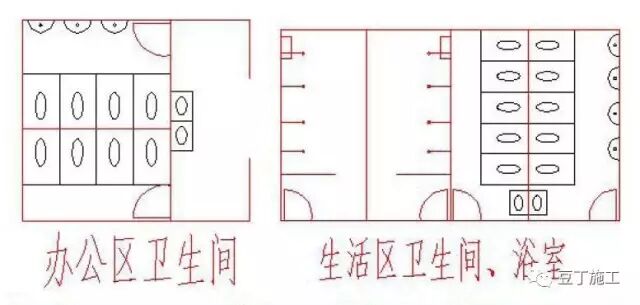 管理人員生活區(qū)設男廁所一個,面積18㎡,內(nèi)設小便斗4 個,蹲坑5 個;女廁所一個面積15㎡,內(nèi)設蹲坑5 個。