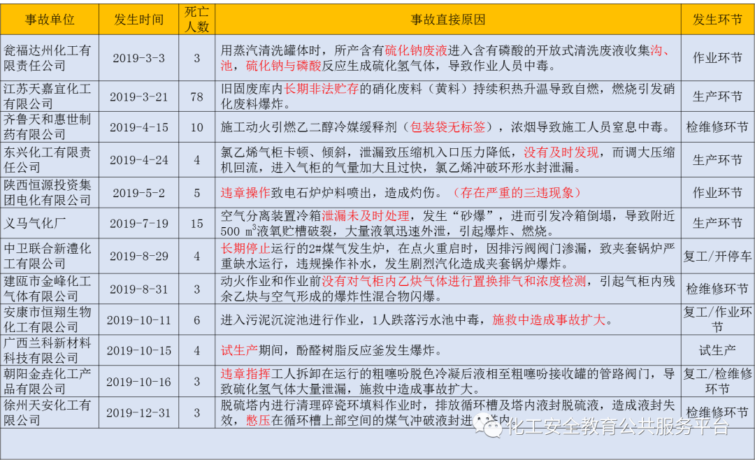 化工安全教育公共服務(wù)平臺(www.ciedu.com.cn)據(jù)公開報道統(tǒng)計,2019年發(fā)生的較大以上事故12起,共造成138人死亡。