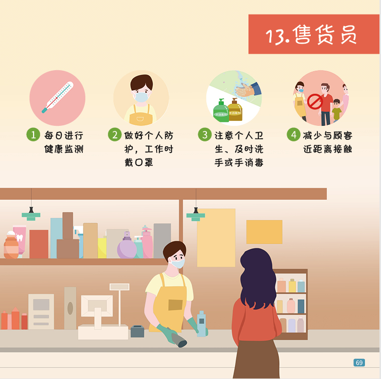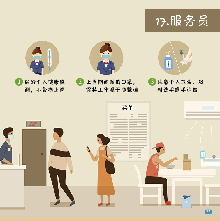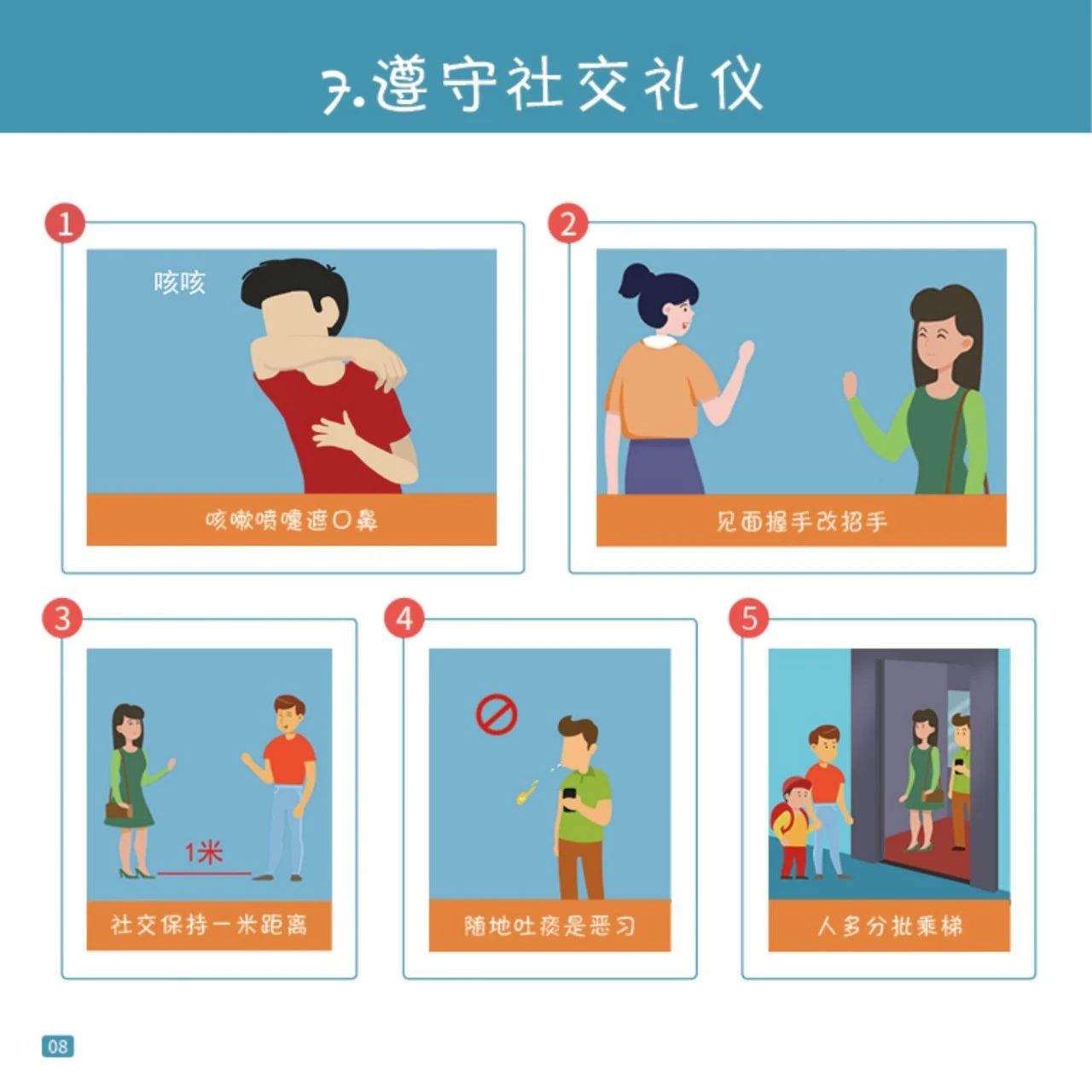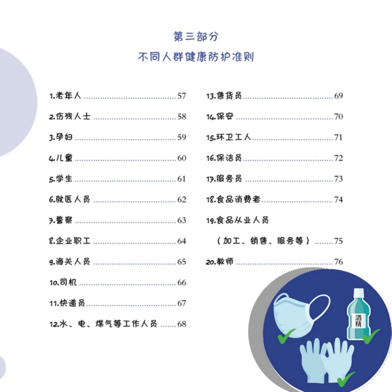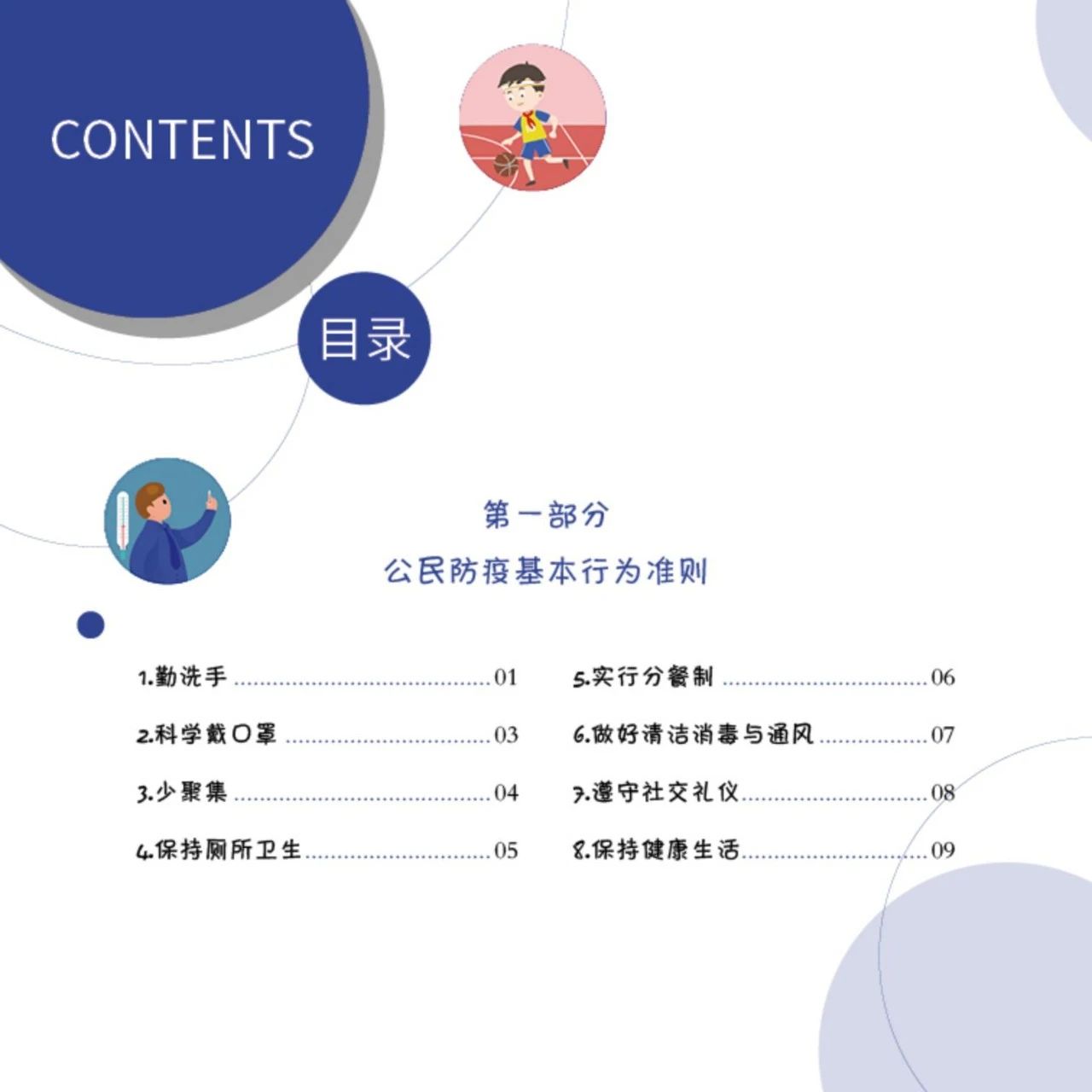 《公民防疫行為準則》(科普版)共三部分73類。 第一部分為公民防疫基本行為準則,包括勤洗手、戴口罩、少聚集、分餐制、社交禮儀以及廁所衛(wèi)生、通風與消毒、健康生活等八方面; 第二部分和第三部分針對重點場所、重點人群主動防疫的關鍵風險點,對不同場景、不同人群提出健康防護準則。 旨在通過圖文并茂、貼近生活的形式,讓公眾看得懂、易接受、記得牢、做得到,將公民防疫行為準則作為一種社會文明風尚和健康生活方式,持久地堅持下去、推廣開來。