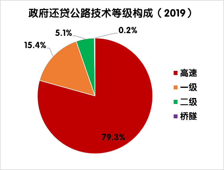 2019年末,全國(guó)政府還貸公路里程9.39萬(wàn)公里,占全國(guó)收費(fèi)公路里程的54.9%。其中,政府還貸高速公路7.45萬(wàn)公里,一級(jí)公路1.44萬(wàn)公里,二級(jí)公路0.48萬(wàn)公里,獨(dú)立橋梁及隧道186公里,占比分別為79.3%、15.4%、5.1%和0.2%。政府還貸高速公路占收費(fèi)高速公路里程的52.1%。