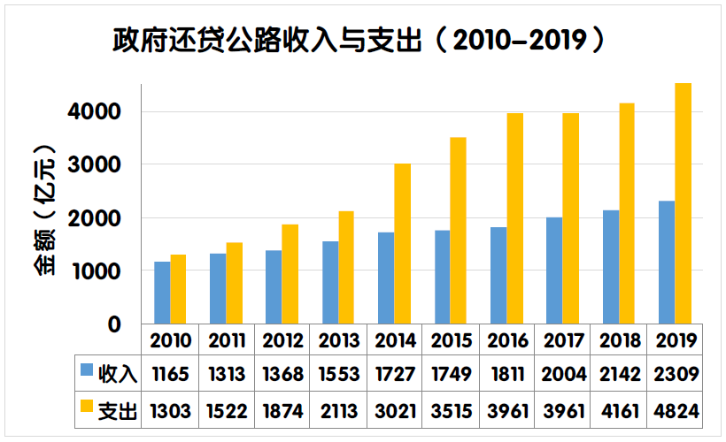 2019年度全國(guó)收費(fèi)公路通行費(fèi)收支缺口比上年增加780.4億元,增長(zhǎng)19.2%。主要原因是2019年度通行費(fèi)支出總額較上年增加。一是2019年度部分收費(fèi)公路債務(wù)到期,償還債務(wù)本金支出較上年凈增525.9億元;二是隨著債務(wù)規(guī)模的擴(kuò)大,償還利息支出凈增169.0億元;三是新建ETC門(mén)架系統(tǒng)、改造ETC車(chē)道、安裝入口不停車(chē)稱(chēng)重檢測(cè)系統(tǒng)、省界收費(fèi)站正線設(shè)施改造工程等支出。