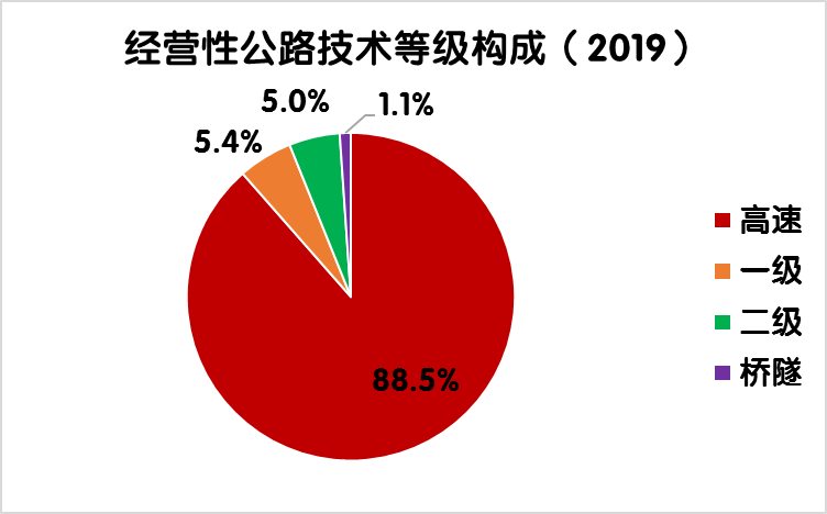 2019年末,全國(guó)收費(fèi)公路里程17.11萬(wàn)公里,占公路總里程501.25萬(wàn)公里的3.4%。其中,高速公路14.28萬(wàn)公里,一級(jí)公路1.86萬(wàn)公里,二級(jí)公路0.87萬(wàn)公里,獨(dú)立橋梁及隧道1024公里,占比分別為83.5%、10.9%、5.1%和0.6%。