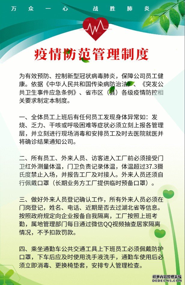 當前,新型冠狀病毒感染的肺炎疫情嚴重威脅人民群眾身體健康和生命安全,特別是節(jié)后工業(yè)企業(yè)陸續(xù)復工復產(chǎn),容易形成人員集聚,疫情防控形勢緊迫,責任重大。企業(yè)必須做好節(jié)后復工復產(chǎn)疫情防控工作。