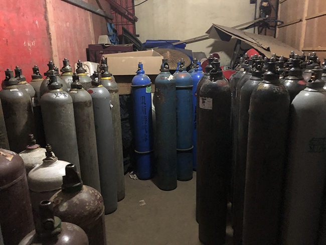 浙江杭州市案例:2021年3月8日上午,浙江省杭州市蕭山區(qū)應(yīng)急管理局執(zhí)法人員對某公司進(jìn)行執(zhí)法檢查。期間,執(zhí)法人員發(fā)現(xiàn)廠區(qū)內(nèi)一簡易鋼棚搭設(shè)的倉庫,玻璃窗均被物體人為遮擋,檢查發(fā)現(xiàn)倉庫內(nèi)堆放了大量危化品,包括滿瓶二氧化碳、氧氣、乙炔、混合氣體、氮?dú)獾?span style="margin-bottom: 37px;line-height: 37px;font-size: 21px">176個(gè)氣瓶。同時(shí),該倉庫緊鄰公司員工宿舍樓搭設(shè),宿舍樓里還住著數(shù)十個(gè)工人,一旦發(fā)生爆炸,后果不堪設(shè)想。
