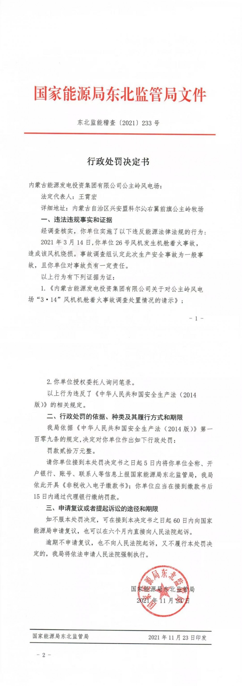 國家能源局東北監(jiān)管局通報內(nèi)蒙古公主嶺風(fēng)場“3.14”風(fēng)機著火事故的處罰
