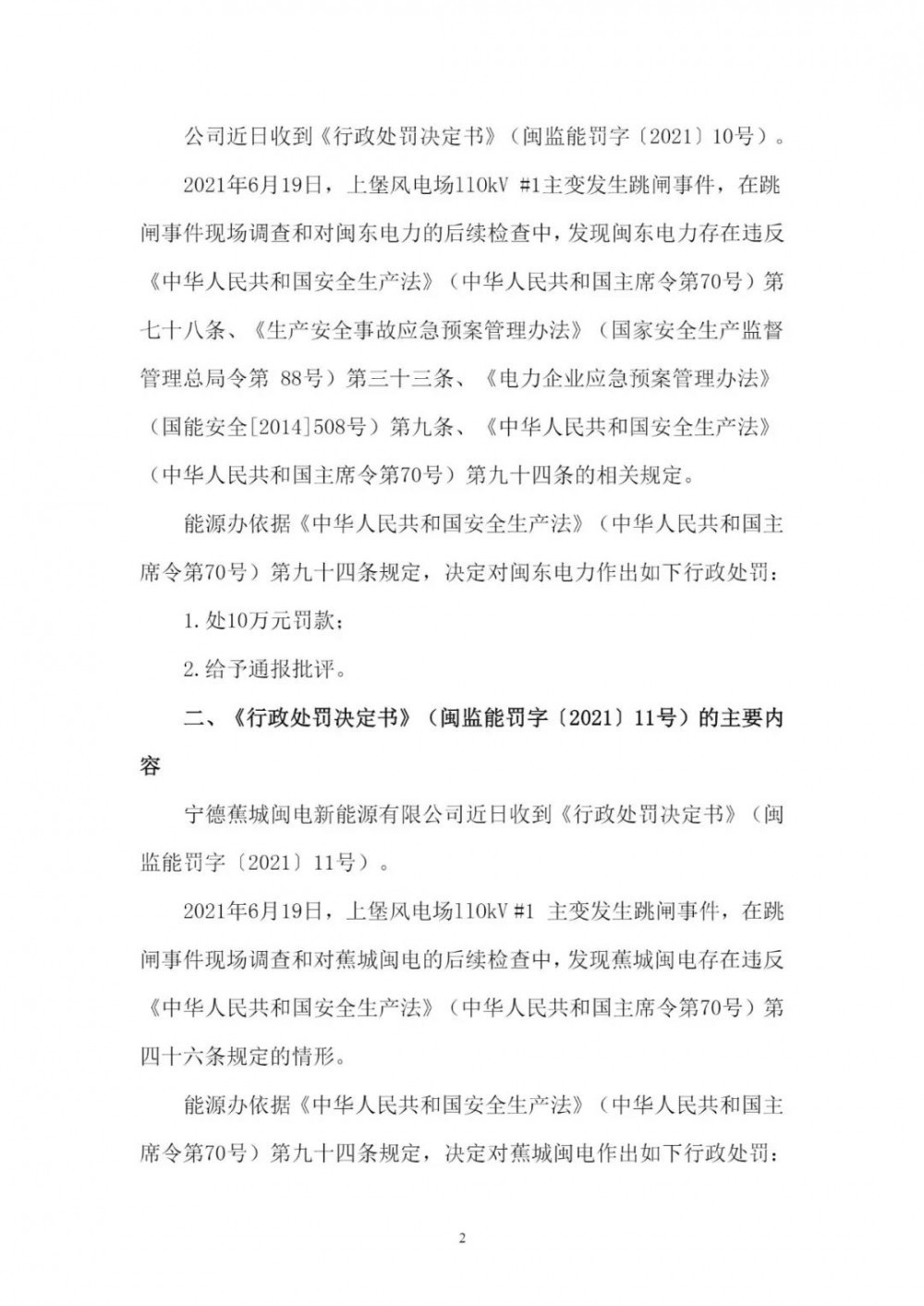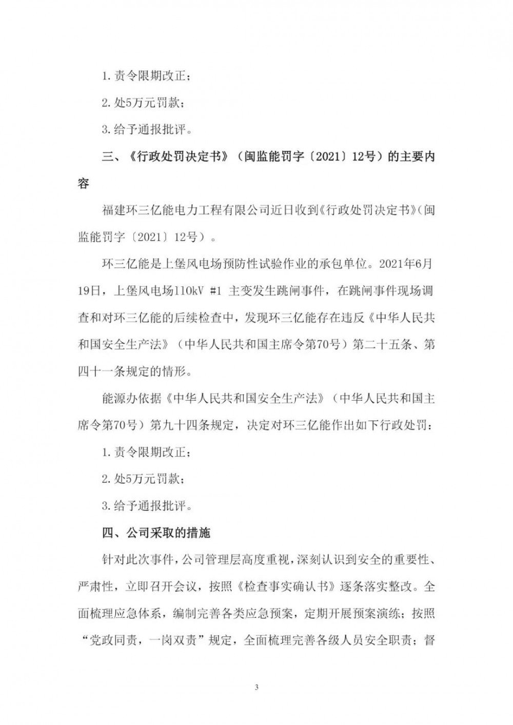 《公告》顯示,2021年6月19日,因上堡風電場110kV#1主變發(fā)生跳閘事件,在跳閘事件現場調查和對閩東電力的后續(xù)檢查中,發(fā)現閩東電力、蕉城閩電、環(huán)三億能均存在違反相關法律條文的情況,分別處以10萬元、5萬元、5萬元的罰款。