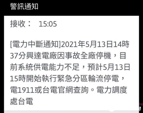 據(jù)報(bào)道,高雄市今天下午近3時(shí),多個(gè)行政區(qū)出現(xiàn)大停電現(xiàn)象,網(wǎng)友抱怨今天天氣30多度,冷氣停電熱到爆。稍早媒體收到“警訊通知”短信,上面寫(xiě)著“5月13日14時(shí)37分興達(dá)電廠因事故全廠停機(jī),目前系統(tǒng)供電能力不足,預(yù)計(jì)5月13日15時(shí)開(kāi)始執(zhí)行緊急分區(qū)輪流停電”。臺(tái)電高雄區(qū)處則說(shuō),目前正在了解厘清。