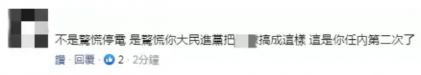 也有網(wǎng)友怒斥民進(jìn)黨當(dāng)局:不是驚慌停電,是驚慌你民進(jìn)黨把臺(tái)灣搞成這樣,這是你任內(nèi)第二次了。↓