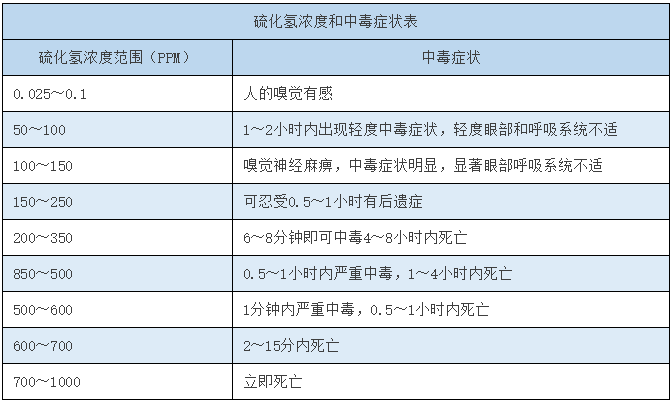 硫化氫能夠直接妨礙肌體對氧的攝取和運(yùn)輸。從而造成細(xì)胞內(nèi)呼吸酶失去活力,造成細(xì)胞缺氧窒息死亡,硫化氫的毒性很強(qiáng),人的絕對致死濃度為1000毫克/米3。當(dāng)空氣中的硫化氫濃度為10~15ppm時(shí)使人們出現(xiàn)中毒癥狀,我國的工作場地環(huán)境最大允許濃度為10ppm。