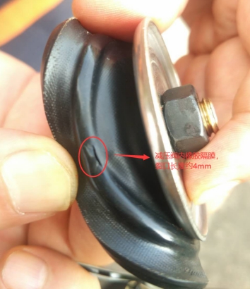 14、氣化器系統(tǒng)(含氣化器出口減壓閥)氣密性試驗(yàn)情況:經(jīng)淮南市特種設(shè)備監(jiān)督檢驗(yàn)中心安全閥校驗(yàn)站使用0.5MPa壓縮空氣對(duì)氣化器系統(tǒng)進(jìn)行氣密性試驗(yàn),發(fā)現(xiàn)減壓中間頸部呼吸孔處泄露,后拆解減壓閥,發(fā)現(xiàn)該減壓閥內(nèi)橡膠隔膜破損,高壓側(cè)氣體直接通過(guò)破損的橡膠隔膜排出。