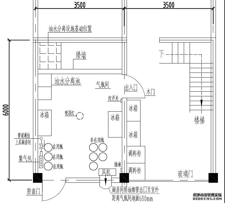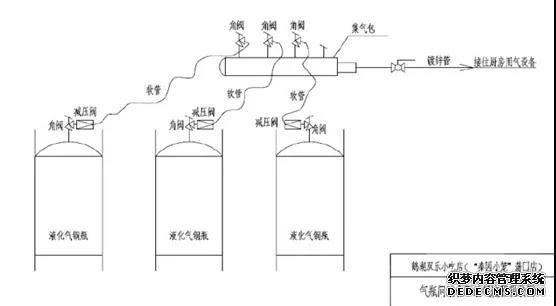 氣瓶間南北向?qū)?.5米,東西向長(zhǎng)6米。沿北墻由西向東依次放置冰箱一臺(tái)、50Kg空瓶5只(編號(hào)為1#、2#、3#、4#、8#);沿南墻由西向東依次設(shè)置油水分離器一套、冰箱一臺(tái)、50Kg液化石油氣鋼瓶3只(編號(hào)由南向北依次9#、6#、7#)。9#、6#、7#鋼瓶中的液化石油氣通過(guò)調(diào)壓閥、燃?xì)庀鹉z軟管連接至集氣包,由集氣包向二樓廚房間送氣。