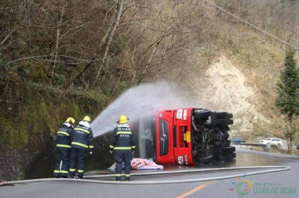 消防隊(duì)員10時(shí)48分到達(dá)現(xiàn)場(chǎng),偵查發(fā)現(xiàn)天然氣槽車側(cè)翻在道路靠山體一旁。經(jīng)偵察,事故車輛為一輛裝載22噸液化天然氣槽罐車側(cè)翻,事故發(fā)生后車內(nèi)兩名司乘人員自行撤離出,身體并無(wú)大礙,車輛罐體表面無(wú)破損,未發(fā)生泄漏。