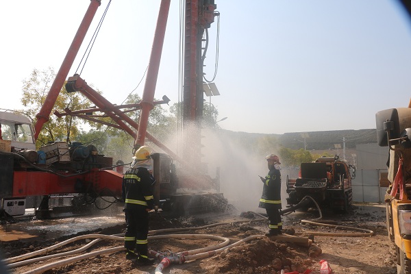 蘭州支隊七里河消防大隊第一時間到達(dá)現(xiàn)場參與處置,到達(dá)現(xiàn)場后發(fā)現(xiàn):現(xiàn)場管道仍處于天然氣泄漏狀態(tài),未有明火發(fā)生?,F(xiàn)場指戰(zhàn)員立即設(shè)置警戒線,對現(xiàn)場圍觀施工人員及群眾進(jìn)行疏散撤離,對泄露事故點毗鄰居民樓進(jìn)行人員通告疏散,同時設(shè)置水槍防護(hù)陣地。隨著增援中隊處置力量的到達(dá),現(xiàn)場處置指揮員七里河大隊大隊長,統(tǒng)一指揮調(diào)度現(xiàn)場事故處置力量:首先,結(jié)合現(xiàn)場街道路況,設(shè)置疏散組,對毗鄰居民樓全面進(jìn)行人員清查疏散。設(shè)置警戒組并專人看守,嚴(yán)防非事故處置人員進(jìn)入。然后在先期到達(dá)成立的消防水槍防護(hù)陣地基礎(chǔ)上,增設(shè)水槍防護(hù)陣地;其次調(diào)派到達(dá)現(xiàn)場的增援消防中隊兩臺水罐消防車全程待命,做好供水保障。