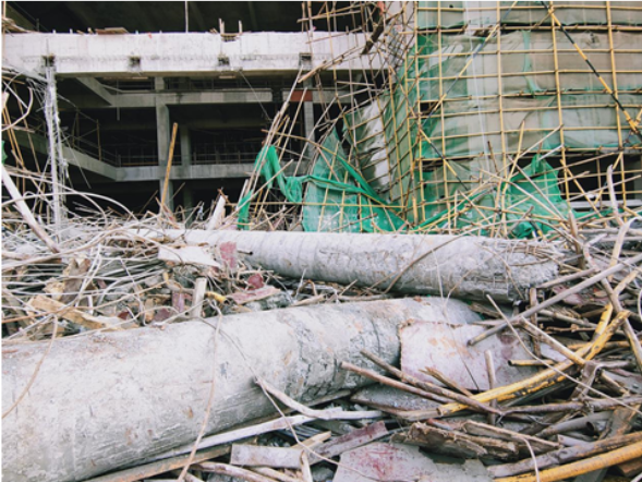 2、天面構(gòu)架混凝土施工工序不當(dāng),未按要求先澆筑結(jié)構(gòu)柱,待其強度達到 75%及以上后再澆筑屋面構(gòu)架及掛板混凝土,且未設(shè)置防止天面構(gòu)架模板支撐側(cè)翻的可靠拉撐。