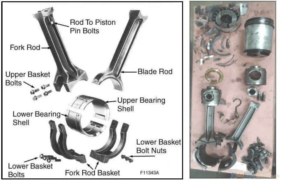 在檢查中,工程師發(fā)現(xiàn)6號曲柄銷(用于6號和14號氣缸)的連桿和活塞處于“完全損壞狀態(tài)”。在油底殼中發(fā)現(xiàn)曲柄總成托架的一個完整螺栓,同時在另外一處發(fā)現(xiàn)了緊固螺母,這證明螺栓和螺母是在運行過程中脫落的。總成的其他螺栓均由于拉伸過度而發(fā)生變形及斷裂。