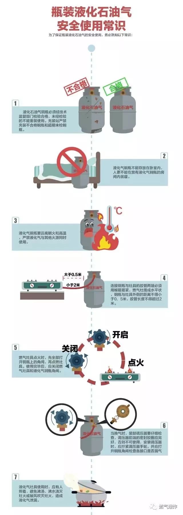 液化氣罐爆炸很可怕,安全使用液化氣罐很重要。所以,除了掌握上面的安全知識,液化氣罐周身遍布銹跡和油漬、用手搖晃液化氣瓶、將液化氣瓶傾斜放置、將液化氣罐放入熱水盆…這些事也萬萬不要做了!