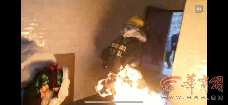救援現(xiàn)場消防員從居民家提著著火的煤氣罐,一路跑出院外,經(jīng)過用厚毯子、濕抹布等,最終將煤氣罐上的明火撲滅。隨后,消防員慢慢擰開煤氣罐進行檢查確認(rèn)。