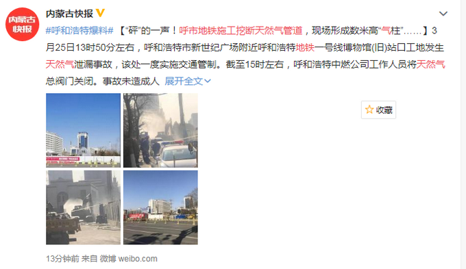 3月25日13時50分左右,呼和浩特市新世紀廣場附近呼和浩特地鐵一號線博物館(舊)站口工地發(fā)生天然氣泄漏事故,該處一度實施交通管制。