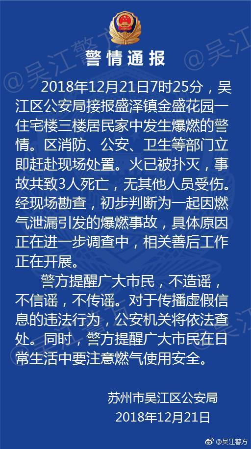 蘇州吳江一小區(qū)疑似發(fā)生煤氣爆炸事故共致3人死亡,無其他人員受傷