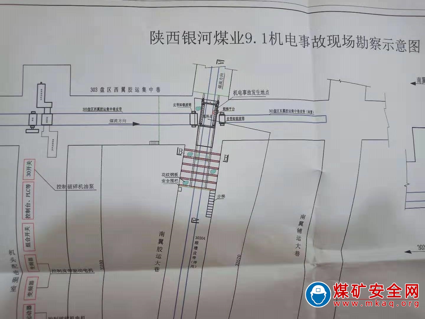 現(xiàn)場(chǎng)勘查認(rèn)定,事故發(fā)生在該礦井下303西翼膠運(yùn)大巷皮帶機(jī)頭與南翼大巷皮帶機(jī)尾處MMD625加長(zhǎng)型破碎機(jī)箱體內(nèi)。