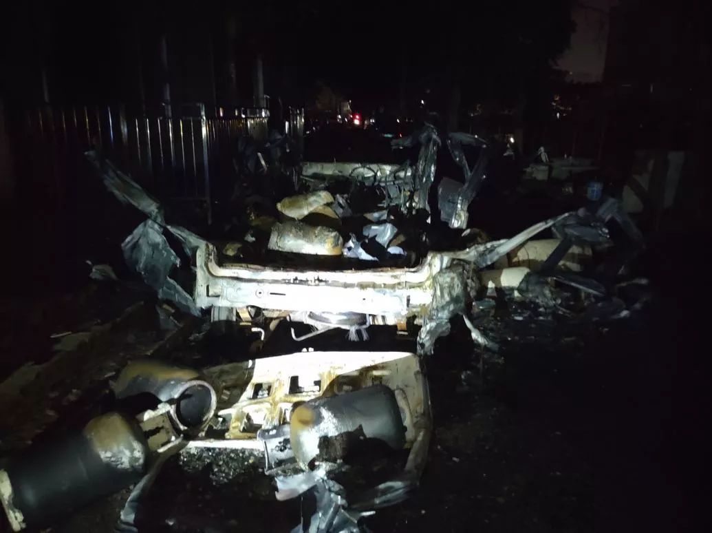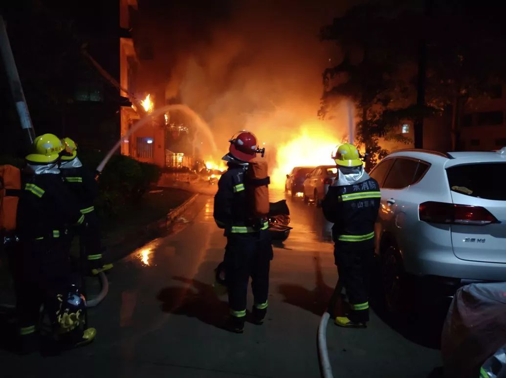 2時(shí)34分,中隊(duì)剛到場,指揮員立即勘查現(xiàn)場,小車已被大火吞噬,火災(zāi)已蔓延到附近的出租屋,有人員被困,聽到有六七聲爆炸聲,并看到有氣瓶飛到河對(duì)面。