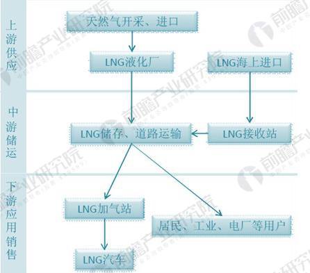 LNG 產業(yè)鏈是一條貫穿天然氣產業(yè)全過程的資金龐大,技術密集的完整鏈系。由陸地或海上油田開采的天然氣在液化工廠經過預處理后進行液化,生產的 LNG 按照貿易合同,通過船運或槽車運輸?shù)?LNG 接收站儲存,再氣化,經由管網送到用戶。具體來看,整個 LNG 產業(yè)鏈主要包括上、中、下游三個環(huán)節(jié)。