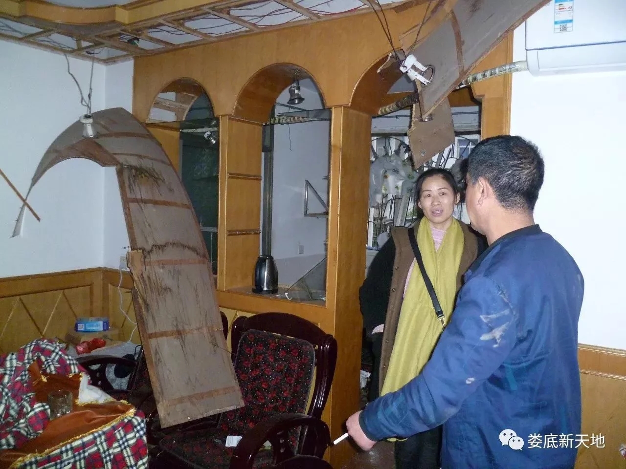下午6時,筆者走進這套位于仙人閣的三室兩廳居室。只見防盜門活脫脫地被強大的氣浪沖開,里層的木門碎裂倒掉,客廳的天花板上也有好幾塊被毀。三個臥室、陽臺、廚房的玻璃全部被震碎,碎玻璃撒了一地,滿地狼藉。臥室的柜子也被沖倒。
