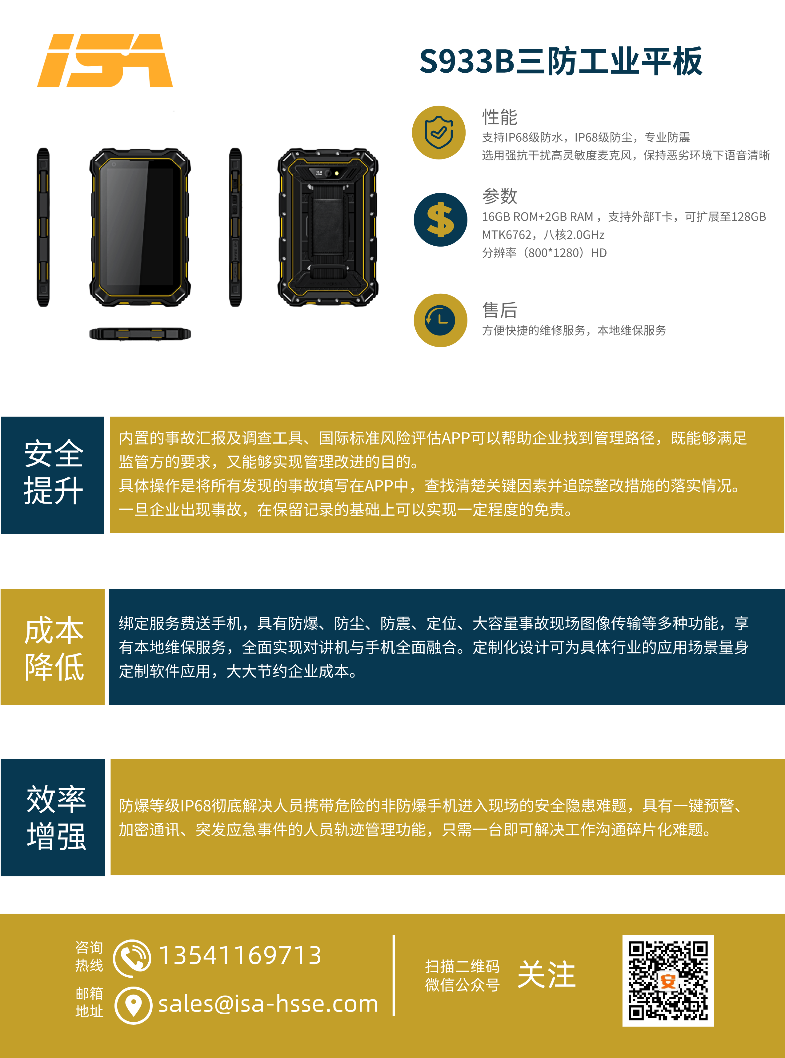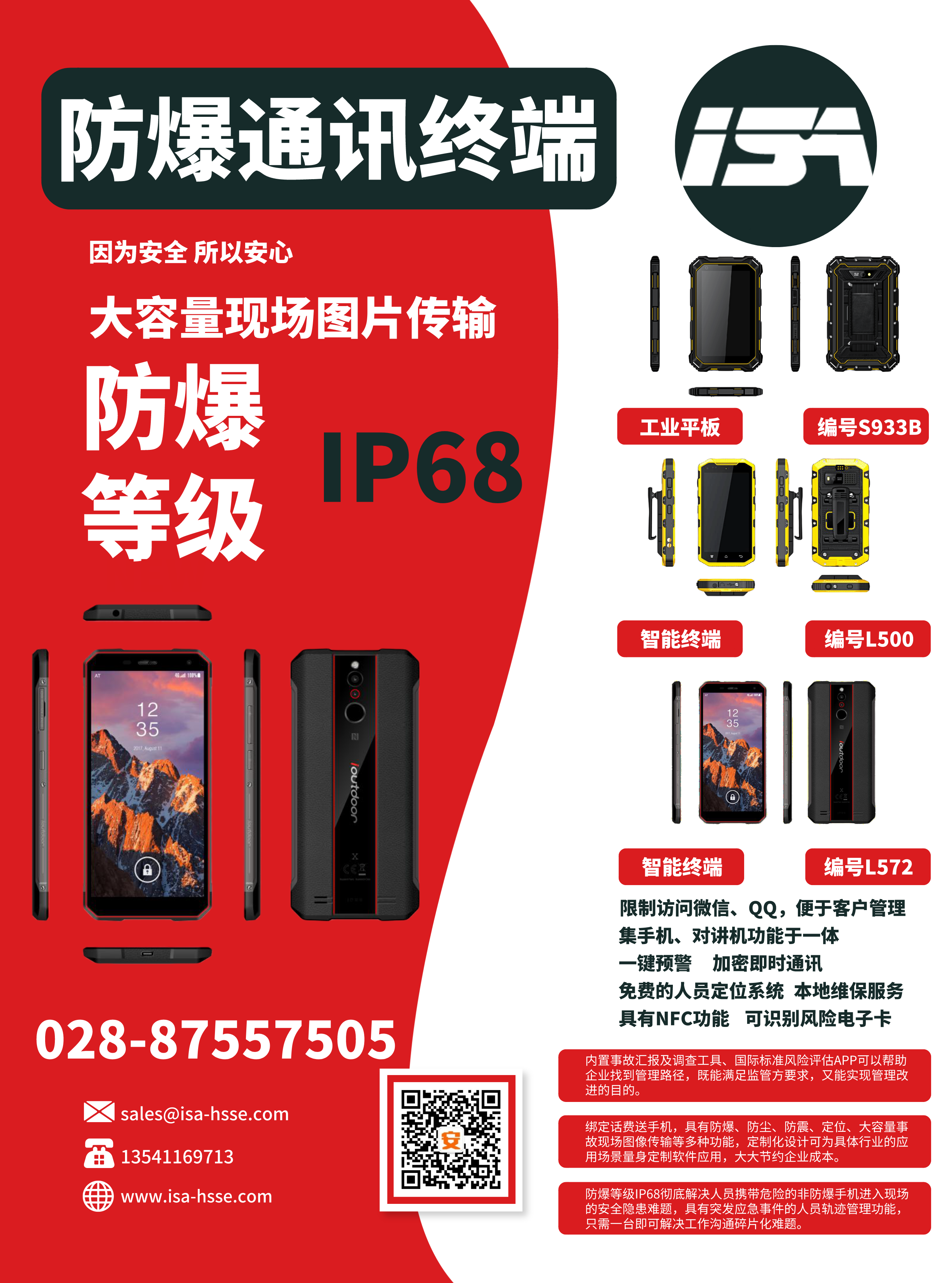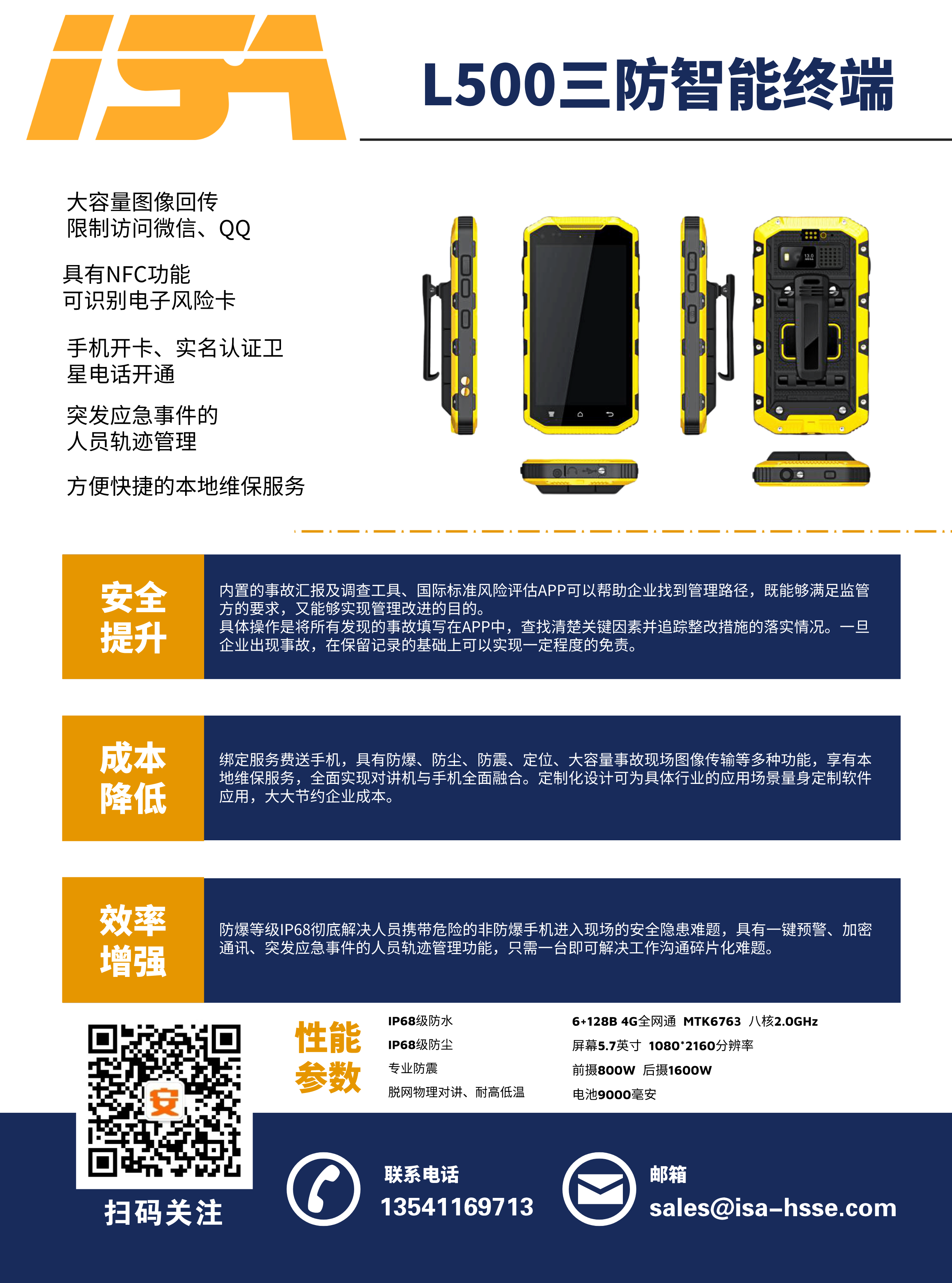公司與運營商推出一款集手機、對講機于一體的防爆手持終端,包括各類商業(yè)安全軟件的使用、圖像回傳功能、一鍵報警、限制訪問微信QQ、NFC等功能。內(nèi)含事故管理APP(隱患排查、風(fēng)險評估),0元開卡,綁定即送話費流量,支持定制化服務(wù)。